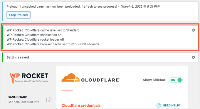 完成设置后,单击“Save Changes”按钮以连接WP Rocket和Cloudflare。您将在您的Cloudflare帐户中看到更改的最佳设置摘要,并且WP Rocket将开始预加载页面。