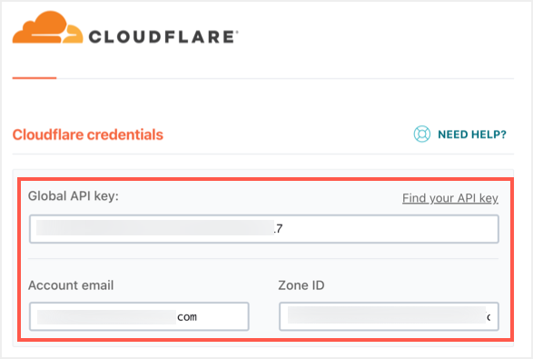 要将WP Rocket与Cloudflare一起使用,您需要允许插件访问您的Cloudflare帐户。这可以通过添加Cloudflare全局API密钥、区域ID以及您的登录电子邮件地址来完成。
