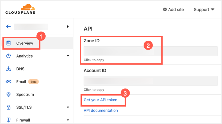 转到您的Cloudflare帐户并选择您的站点以查看仪表盘。您将登陆“Overview”部分并向下滚动以查看“API”部分(这将显示在右侧边栏上)。您可以在此处找到Zone ID,将其复制并粘贴到您的WP Rocket Zone ID文本框中。之后单击显示在您的帐户ID下方的“Get your API token”链接。