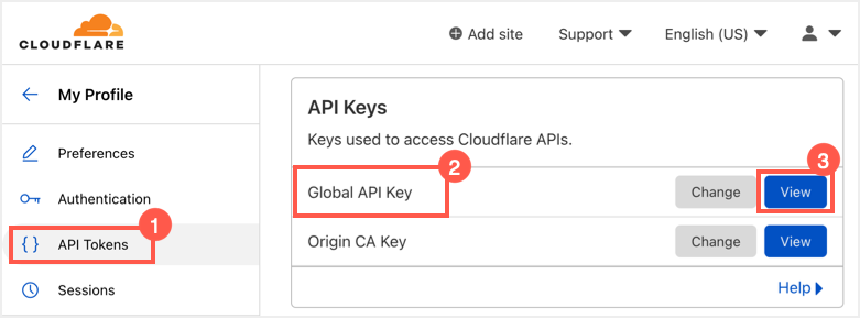 这将带您进入帐户资料中的“API Tokens”部分。您可以在“API Keys”部分看到“Global API Key”和“Origin CA Key”。单击Global API Key选项的“View”按钮。