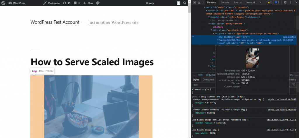 例如,如果最大显示尺寸为500 x 500像素,则无需上传2000 x 2000像素的图像。因此,要找出图像的最大显示尺寸,请使用检查工具: