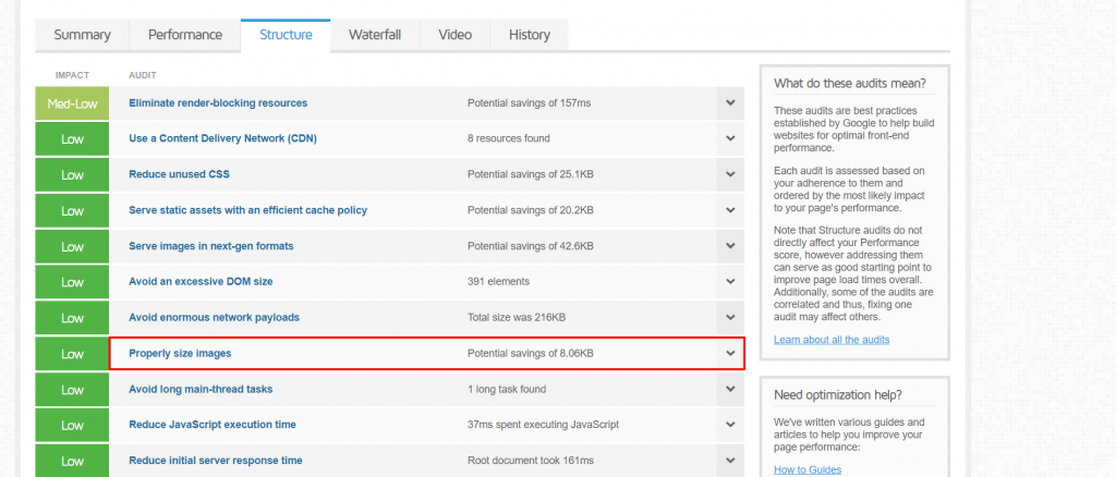2. 完成网站分析后,转到“Structure”选项卡并单击“Properly size images”部分。