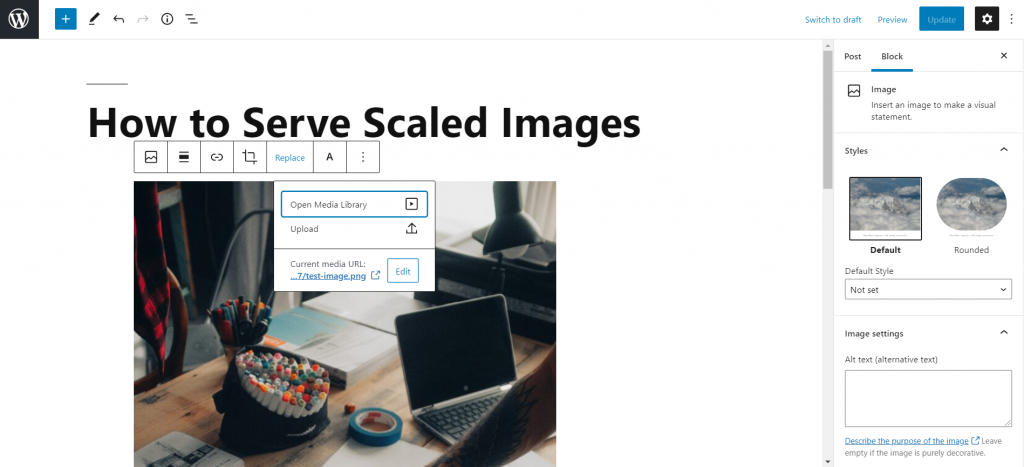 3. 在文章上,单击要缩放的图像。选择替换->打开媒体库。