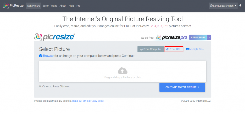 2. 粘贴您要编辑的图像的URL,然后单击Continue to Edit Picture。