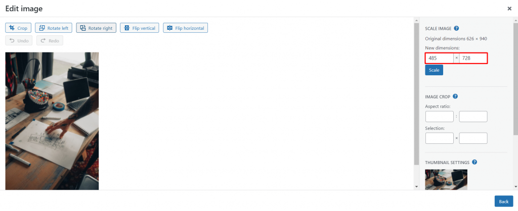 5. 在Scale Image部分下,您将看到原始图像的大小。在其下方的字段中输入新的缩放尺寸 – 基于上一步中的Rendered size。请注意,当您键入水平尺寸时,垂直尺寸会自动调整。单击Scale。