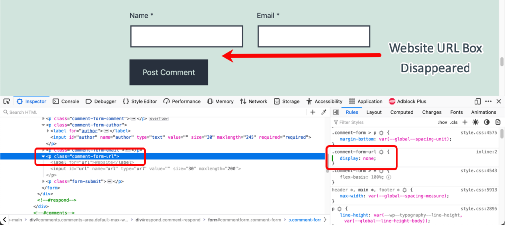 当你查看评论表单的源代码时,你可以很容易地发现WordPress使用comment-form-url类在表单中显示网站URL。您需要做的只是简单地转到“外观 > 附加CSS”部分,粘贴以下CSS代码并发布您的网站。