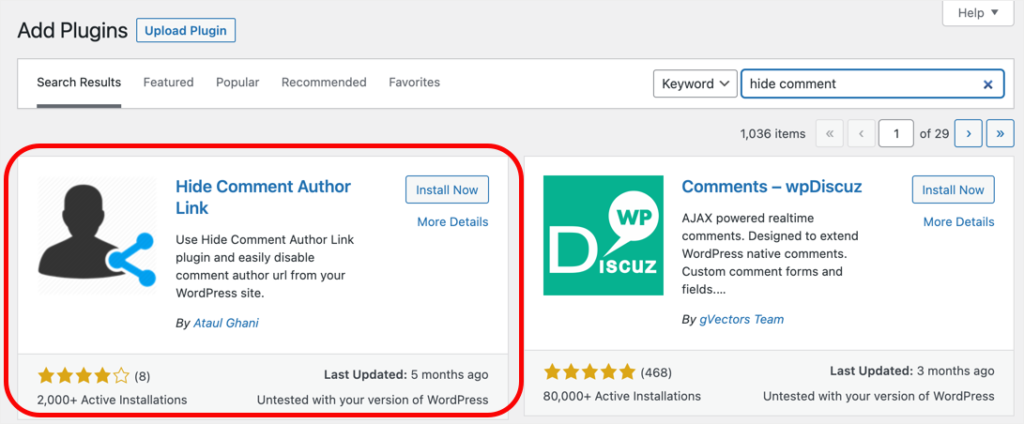 这是一种超级简单且免费的方法。转到WordPress管理面板中的“插件 > 安装插件”部分并安装“Hide Comment Author Link”插件。