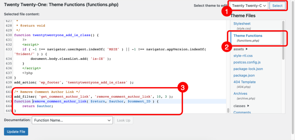 您可以转到“外观 > 主题编辑器”部分并为您的活动主题找到“functions.php”文件。将以下代码粘贴到文件末尾,然后单击“更新文件”按钮。
