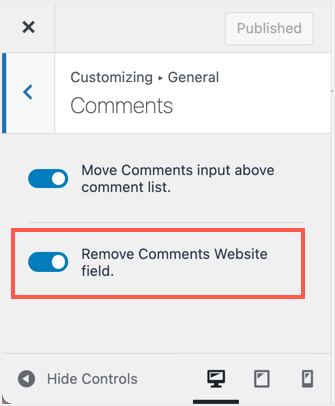 有些主题允许您禁用在WordPress评论表单中提交的评论和网站URL。例如,您可以使用流行的Kadence主题轻松完成此操作,只需单击定制器设置。在尝试上述任何选项之前,请检查您的主题是否提供此类功能。