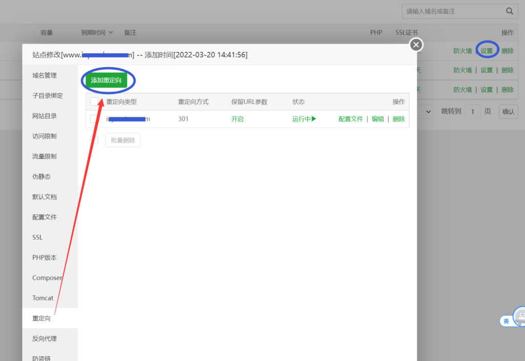 在宝塔面板中添加重定向规则