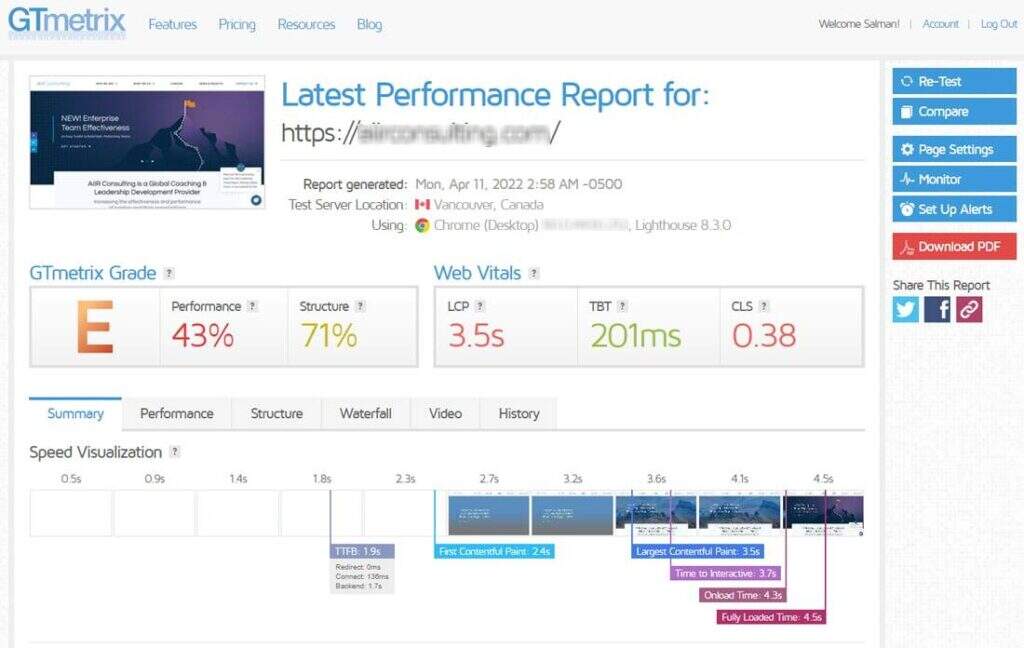 测试完成后,您将看到如下GTmetrix性能报告。