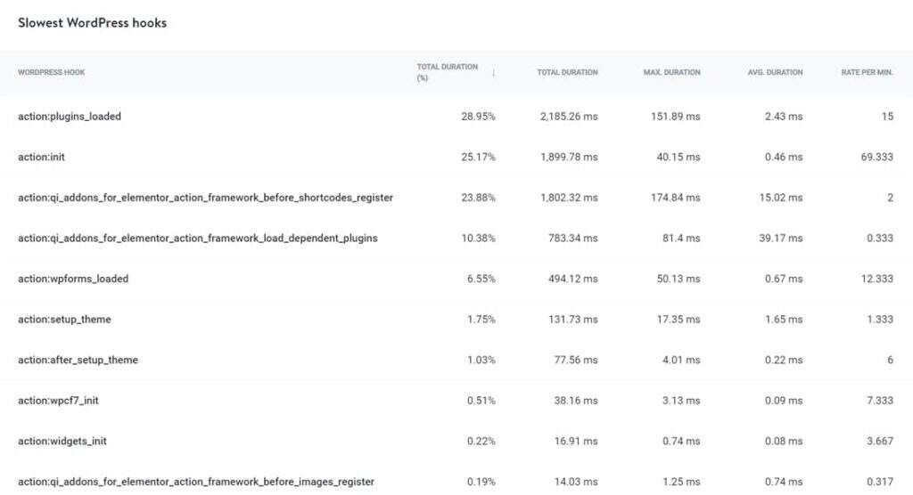 向下滚动此选项卡将显示最慢的WordPress钩子。