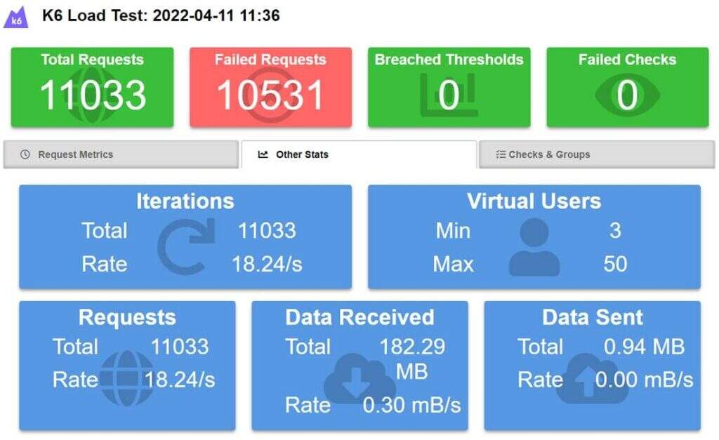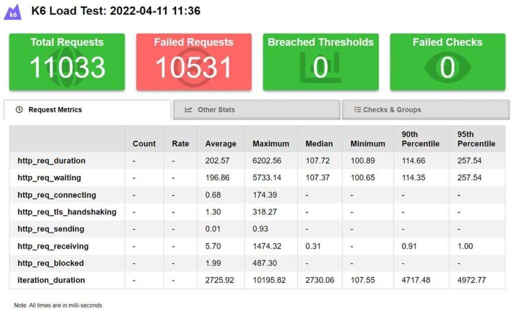 结合其出色的k6 Reporter扩展,您可以运行负载测试并在HTML中获得精确的结果: