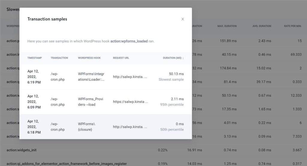 跟踪最慢的WordPress钩子是APM最有用的功能之一。您可以单击挂钩项目以查看其事务样本。