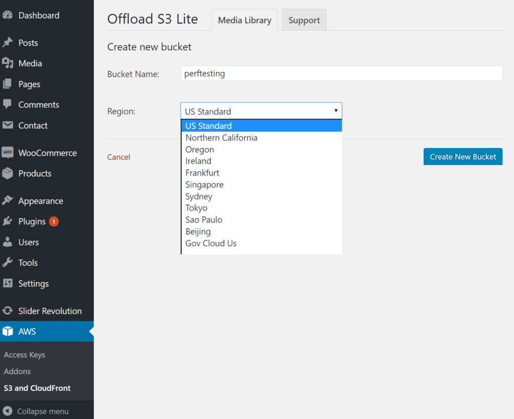 然后,您必须创建一个要使用的Bucket。如果您尚未注册Amazon S3,您可以在此处注册。他们有一个免费试用版,您可以开始使用。单击AWS插件设置下的“S3 and CloudFront”,然后单击“Create bucket”。然后,您可以选择一个地区。单击“Create New Bucket”。请记住,存储成本因地区而异。查看价格。