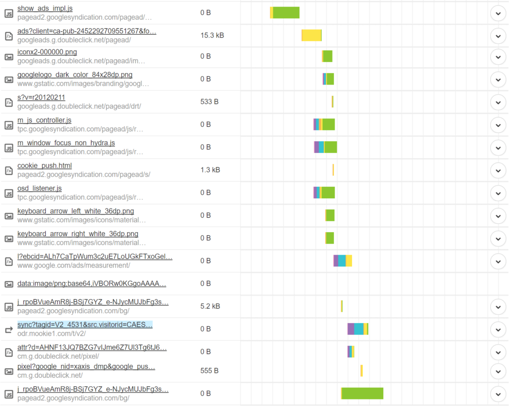 我们喜欢将Google AdSense称为可变的3rd-party服务。这是因为每次加载页面时都会加载不同数量的请求和资产。这使得很难确定是什么导致了性能问题,因为每次运行速度测试都会有所不同。以下只是广告生成的一些第3方请求的片段。它们还生成重定向,它们有自己的延迟。