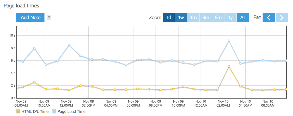 但具有讽刺意味的是,New Relic也可能导致性能问题。在这种情况下,我们建议将其用于故障排除和零星监控,而不是持续使用。您还可以使用GTMetrix之类的工具在您的站点上安排每小时速度检查。几天后,您可以查看并在一个漂亮的小图表中查看结果: