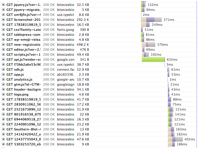 那里有一个资产似乎会阻止后续资产,看看中间附近的绿色条。原来这是来自Google Recaptcha。632ms看似一瞬间,但实际上却是很多。一个页面真的应该在2 seconds-ish内加载。其中超过三分之一仅由这一资产占用。资产应该稍后加载,或者应该放弃它以支持其他验证方法。