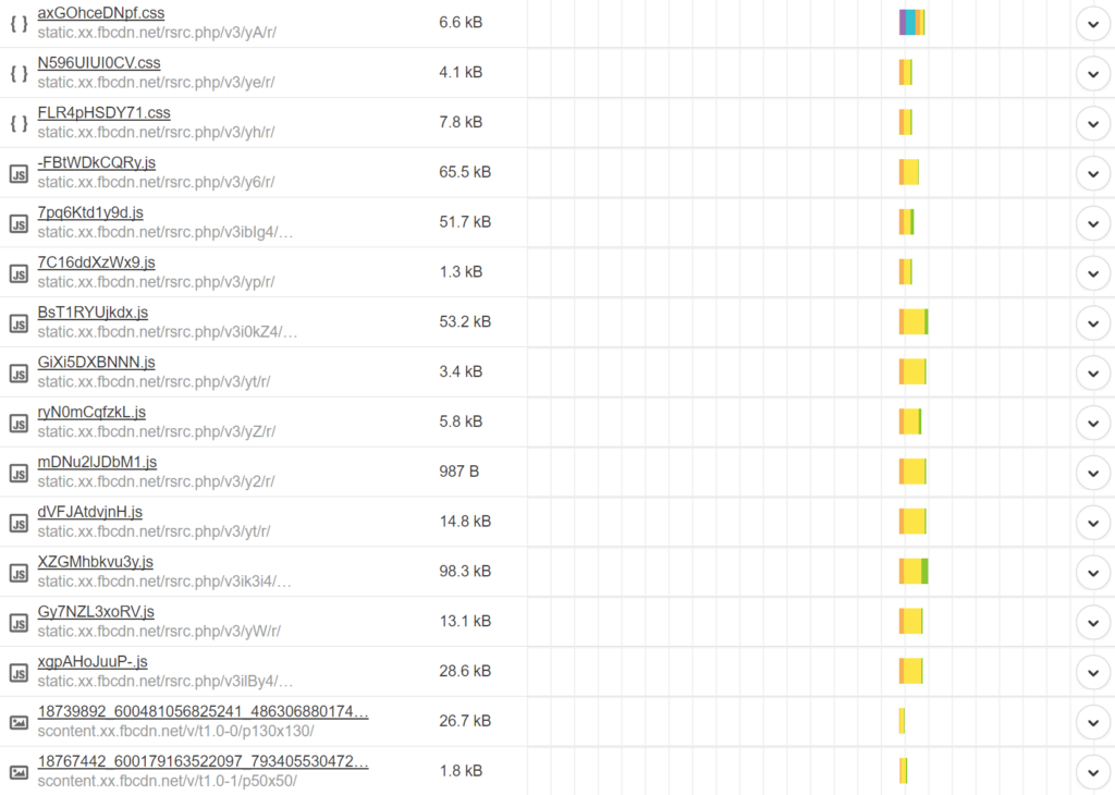 接下来要看的是导致所有这些static.xx.fbcdn.net和scontent.xx.fbcdn.net请求的Facebook类似框。我们可以看到这些条相当短,这意味着它们不会造成太多延迟。但是,一旦将它们全部加在一起,这就是问题所在。同样,这是一个绝对数量的问题。