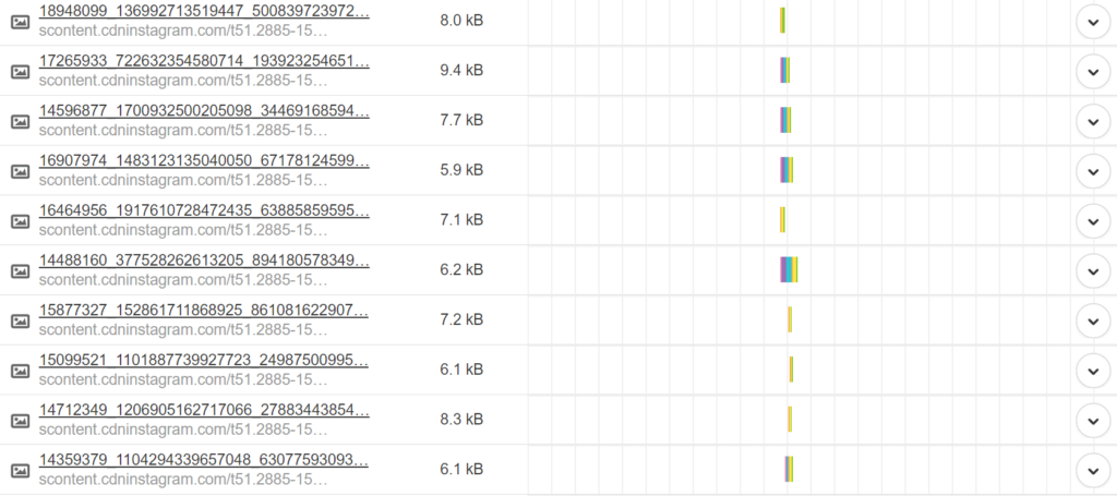 接下来要看的是Instagram Widget。在我们的示例中,我们使用的是免费的Instagram Feed插件。该插件实际上不是问题,而是生成的来自scontent.cdninstagram.com的请求。我们可以看到这些条相当短,这意味着它们不会造成太多延迟。但是,一旦将它们全部加在一起,这就是问题所在。同样,这是一个绝对数量的问题。您可能会看到这里形成了一种模式。WordPress网站上的许多3rd-party性能问题不是来自单个请求的延迟,而是那些不关心性能的开始。