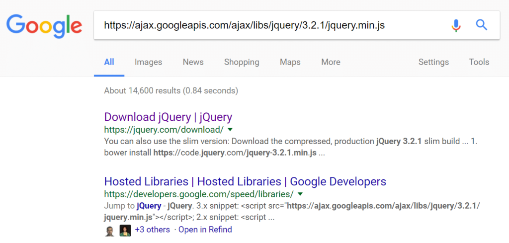 如果您不知道外部服务的用途,您可以随时尝试浏览主域或在Google中搜索其名称,因为应该会出现相关的开发人员或公司。这是确定服务是否合法的好方法。正如您在下面看到的,搜索jQuery文件会导致一些知名公司(如jQuery和Google)描述托管此文件。所以你可能是安全的。