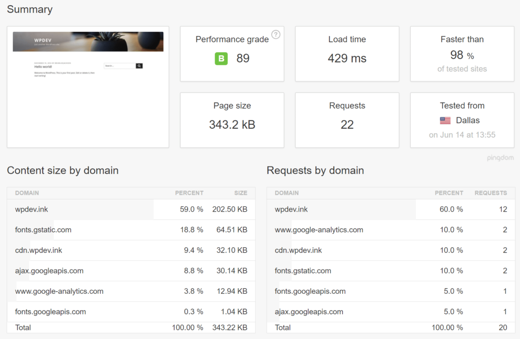 这将使我们能够一项一项地删除每项服务,并向您展示它们对您的整体网站负载的影响程度。我们还将分享一些加载它们的替代方法的策略。然后,您可以将相同的策略应用于您自己的WordPress网站。我们通过Pingdom运行测试站点,您可以看到的第一件事是“按域的内容大小”和“按域的请求”。如果您看到请求,而不是来自您的域名,则这些请求很可能是外部服务或外部资产。这是一个很好的起点。正如您在下面看到的,static.xx.fbcdn.net有37个请求,这不好!