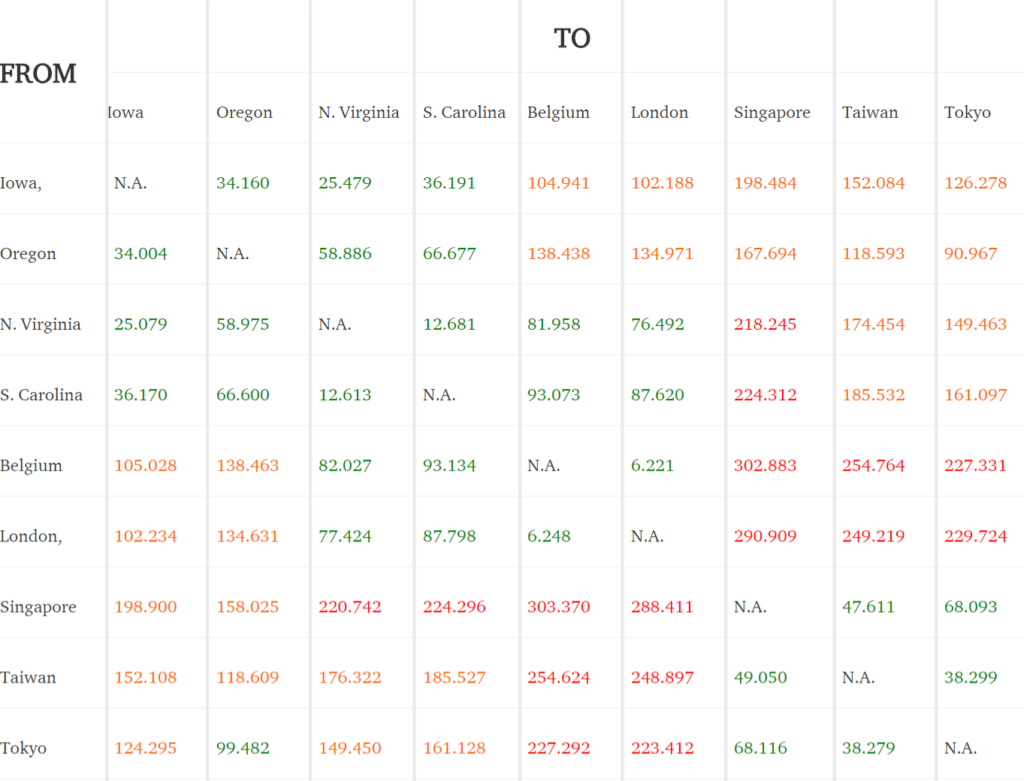上面我们正在测试与ping服务器相关的服务器所在位置的Ping时间。但是Google Cloud Platform区域本身之间的延迟呢?Geek Flare在9个不同地区之间进行了出色的测试。这可以让您快速了解放置在一个区域与另一个区域时由于延迟而发生的延迟。