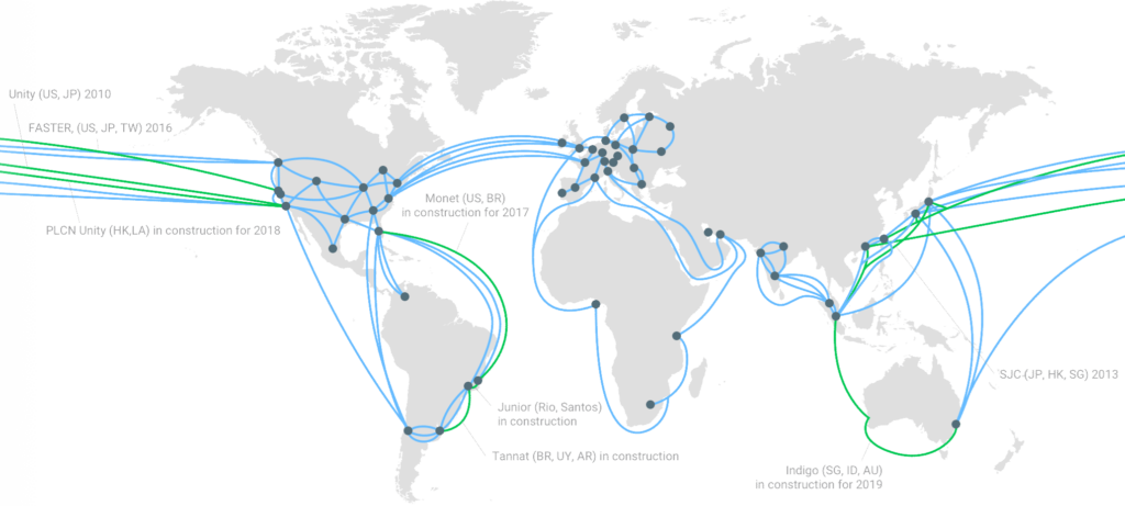 换句话说,距离越远,延迟越大,这等同于更长的延迟。当涉及到通过光纤电缆传输的数据时,您无法超越光速。例如,下面是Google Cloud Platform网络的地图。他们有数千英里的电缆在海底覆盖整个地球。这就是为什么它是世界上最快的网络之一的原因之一。即使拥有这种广泛的最先进网络,仍然总是会有延迟延迟。
