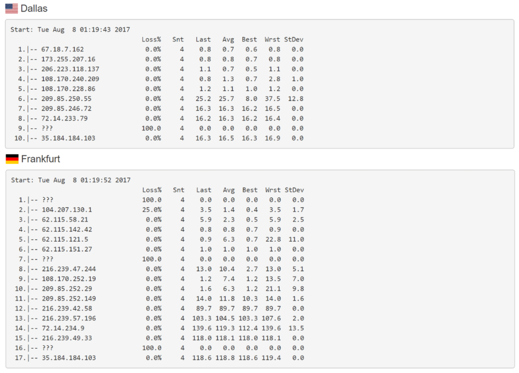 如果我们比较Traceroute,您可以看到一个示例,从美国爱荷华州到德国法兰克福需要7个额外的网络跃点(与从达拉斯的10个跃点相比)。这就是为什么重要的是要记住,网络跃点也会影响网络延迟。