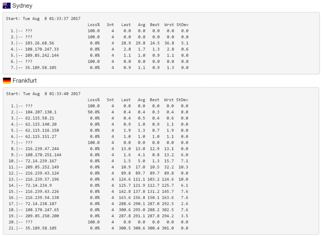 如果我们比较Traceroute,您可以看到一个示例 ,从澳大利亚悉尼到德国法兰克福需要14个额外的网络跃点。
