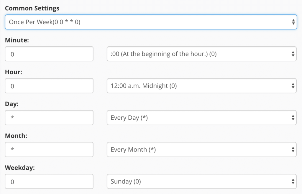 在Add New Cron Job部分下,您可以从许多不同的预定义计划中进行选择,例如每小时两次或每周一次。您的托管服务提供商很可能对允许运行cron作业的频率有限制。每小时两次是共享主机的常见设置。