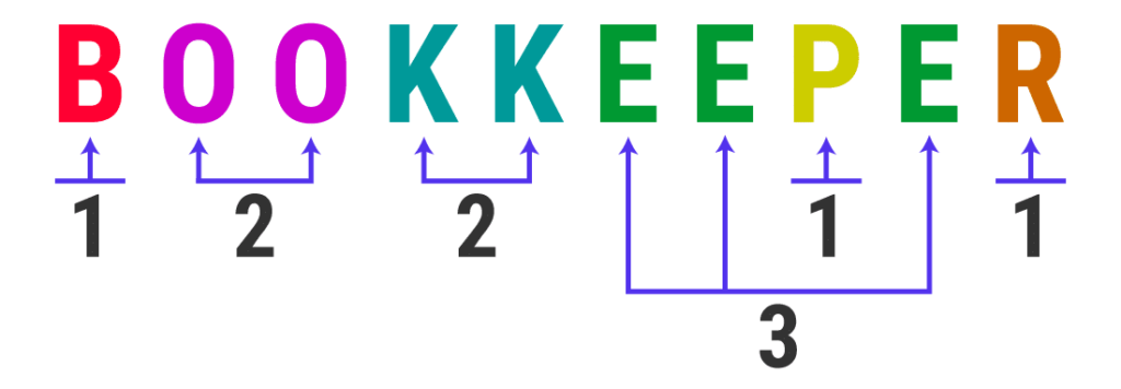 10个字符的字符串如BOOKKEEPER将需要10个字节(80位)的内存。您可以看到它包含1个字母实例B, P, R,2个字母实例O和K,3个字母实例E。