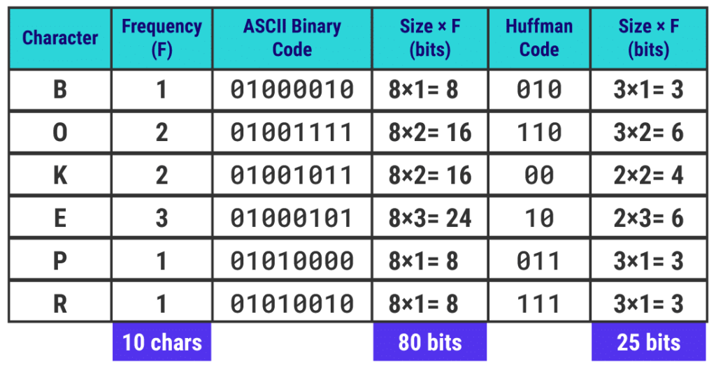 要了解霍夫曼编码算法的工作原理,请考虑单词BOOKKEEPER。它有10个字符长,但它只有6个独特的字符。这个词很好地混合了单、双和三字母。