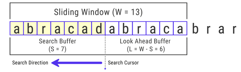 在上面的例子中,滑动窗口大小只有13个字符长(13个字节)。但是,GZIP压缩可以使用32KB(32,768字节)的最大滑动窗口大小。滑动窗口的大小对LZ77压缩性能起着关键作用。