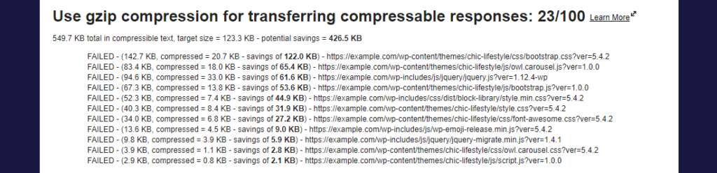 如果您的网站不提供基于文本的压缩资源,GTmetrix会显示警告。与Google PageSpeed Insights一样,它还会向您展示您可以实现的潜在节省。