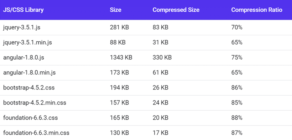 如前所述,与竞争对手相比,GZIP没有最好的压缩比。但这也离他们不远了。通常,它可以帮助您将基于文本的资源的大小减少70-90%。