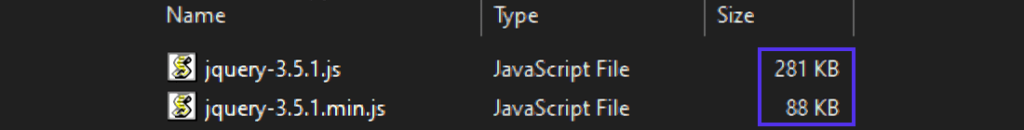 例如,jQuery 3.5.1库的未压缩版本比同一文件的缩小版本大3倍以上。