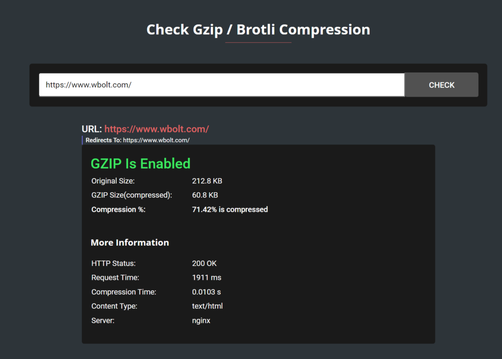 最后,您应该测试一下您的服务器是否启用了GZIP压缩。您可以参考Nginx文档以获取所有ngx_http_gzip_module指令的最新列表。