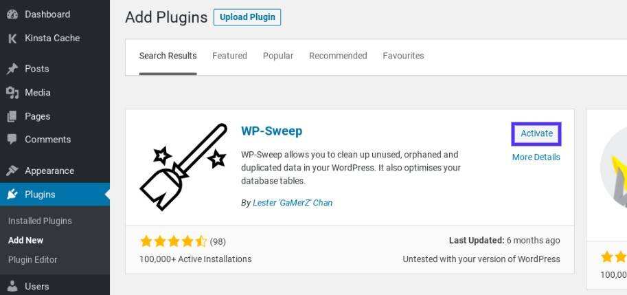 WP-Sweep是一款免费且易于使用的工具,可让您快速简单地清理数据库中的旧版本。要安装它,请导航到WordPress 仪表板中的插件 > 安装插件。搜索插件,然后选择立即安装并启用: