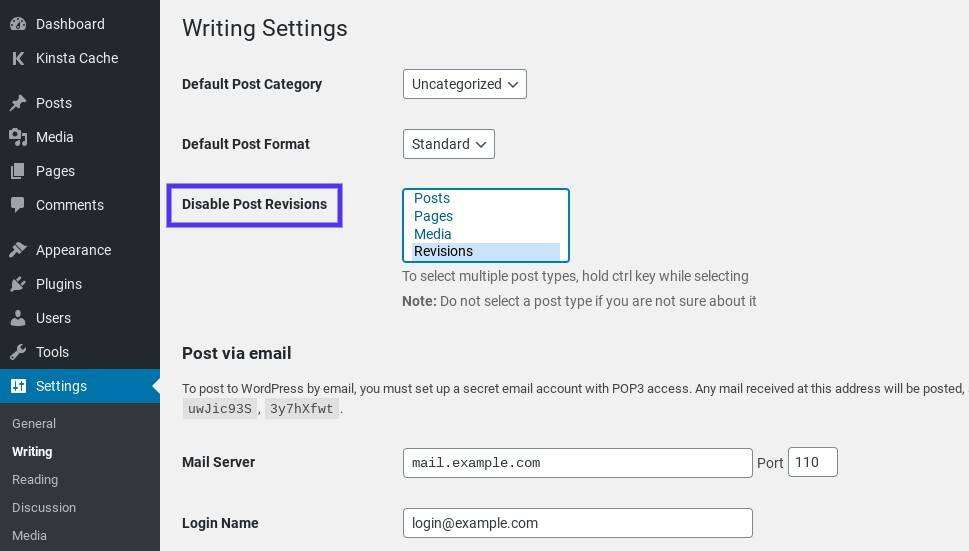 如果您不习惯编辑wp-config.php文件,您还可以使用轻量级插件(例如Disable Post Revision )禁用WordPress中的修订。安装并激活此工具后,您可以通过转到WordPress 仪表板中的设置 > 撰写来访问它: