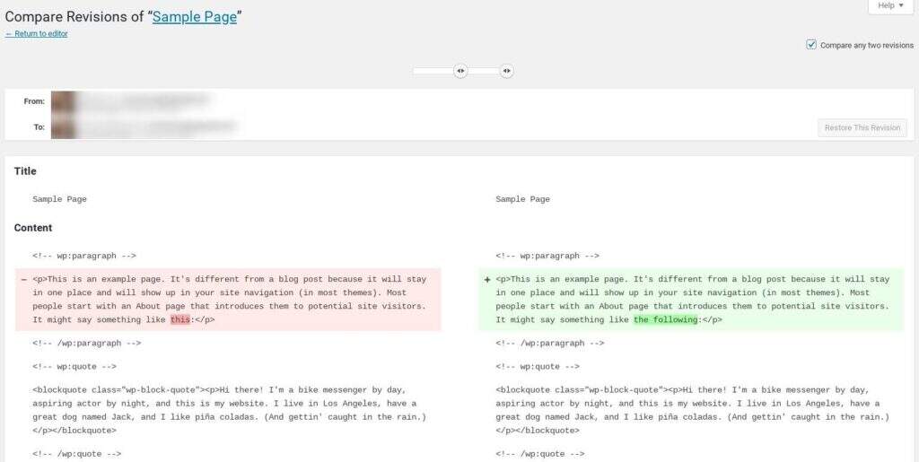 单击此按钮可访问“修订”页面,您可以在其中查看所有已保存的编辑并并排比较任意两个修订。您将看到两列:左侧显示帖子或页面的先前版本,右侧显示您选择的版本。