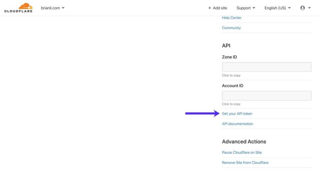 在Cloudflare仪表盘中,单击“Overview”选项卡。接下来,向下滚动并单击右侧边栏中的Get Your API Token。