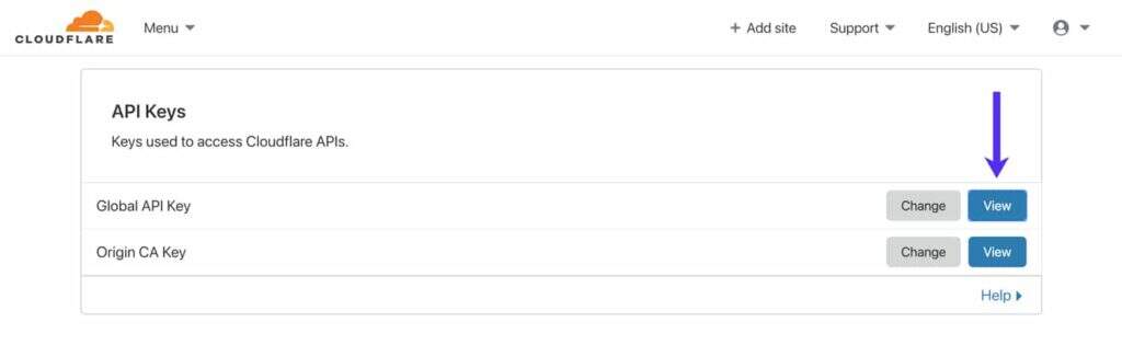 向下滚动,然后单击“Global API Key”旁边的View以获取您的Cloudflare API密钥。请注意不要在W3 Total Cache之外的任何地方共享此API密钥,因为它可用于控制您的Cloudflare帐户。