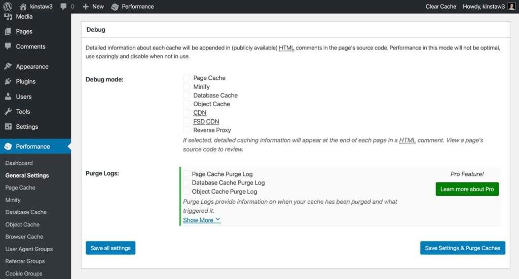 如果您正在对站点上的问题进行故障排除,W3 Total Cache有一个方便的“Debug”菜单,可让您禁用特定的缓存层和优化设置。例如,如果您发现网站上出现视觉故障,您可以为“Minify”选项启用调试模式,这会将HTML注释插入到您的页面源代码中以帮助您进行故障排除。