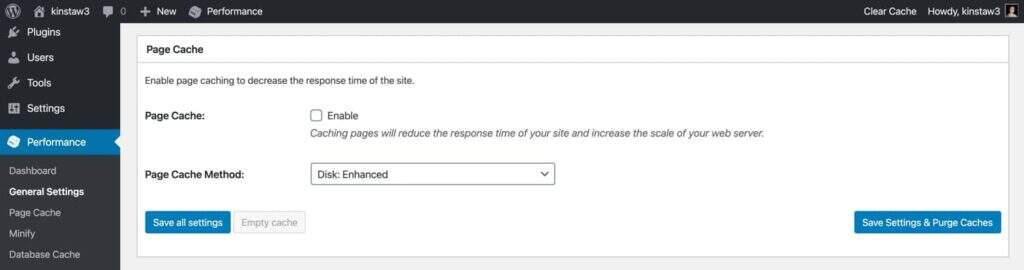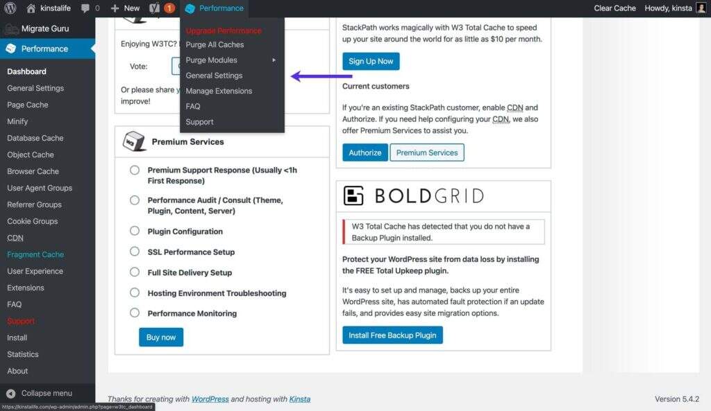安装W3 Total Cache后,您将在WordPress管理仪表盘的侧栏中看到“性能”选项卡。单击“Performance”选项卡将显示各种子菜单,如“General Settings”, “Page Cache”, “Minify”等。