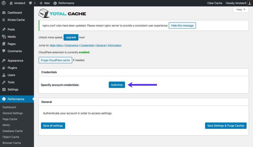 接下来,在W3 Total Cache的“Extensions”页面中激活Cloudflare扩展,然后单击“Settings”。在“Credentials”部分,单击“Authorize”按钮。