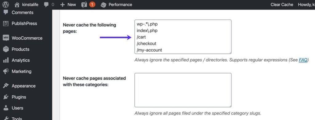 为安全起见,我们还建议绕过WooCommerce特定的URL,例如购物车页面、结帐页面和帐户页面。要从缓存中绕过这些页面,请转到W3TC的“Page Cache”设置,并将URL添加到“Never Cache the Following Pages”部分。