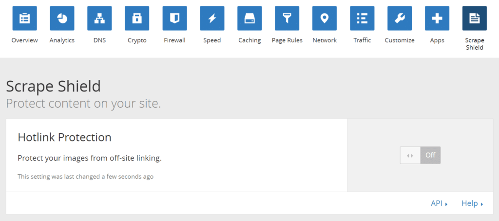 如果您使用的是Cloudflare,则可以在您的帐户中的Scrape Shield下轻松启用盗链保护。盗链保护对抓取没有影响,但会阻止图片在谷歌图片、Pinterest 等网站上显示。 由于Cloudflare是完全代理服务,因此您无需担心在源服务器上启用盗链保护.