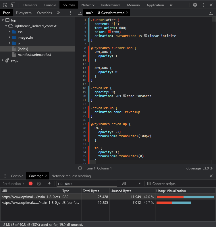 CSS和JavaScript资产显示在覆盖范围面板中,未使用代码的比例用红色表示。单击任何文件以查看其源代码,未使用的代码在行号栏中以红色突出显示。