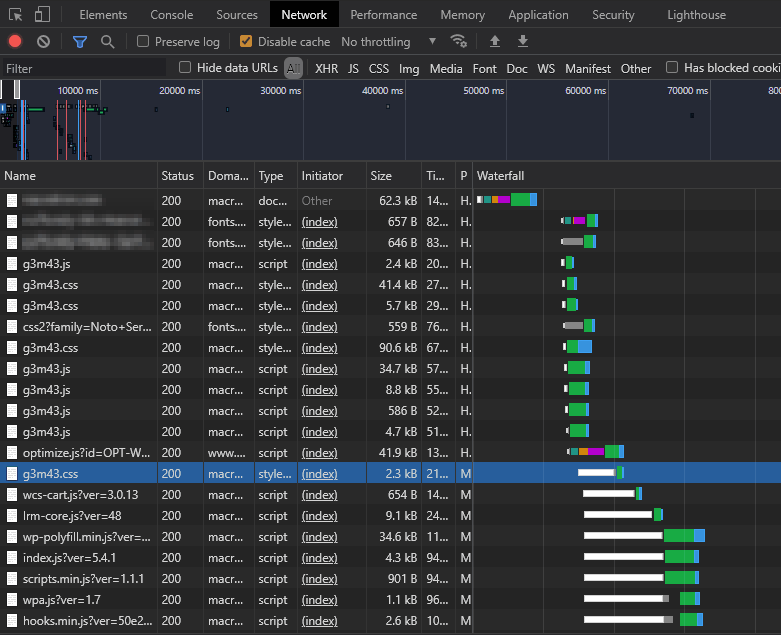 任何耗时较长的加载进度条都值得关注,但您应该特别关注堵塞/停滞加载进度条(显示为白色)。在本例中,高亮显示的行和所有后续行都无法开始下载,直到在HTML页面顶部处理了渲染阻塞CSS和JavaScript文件。